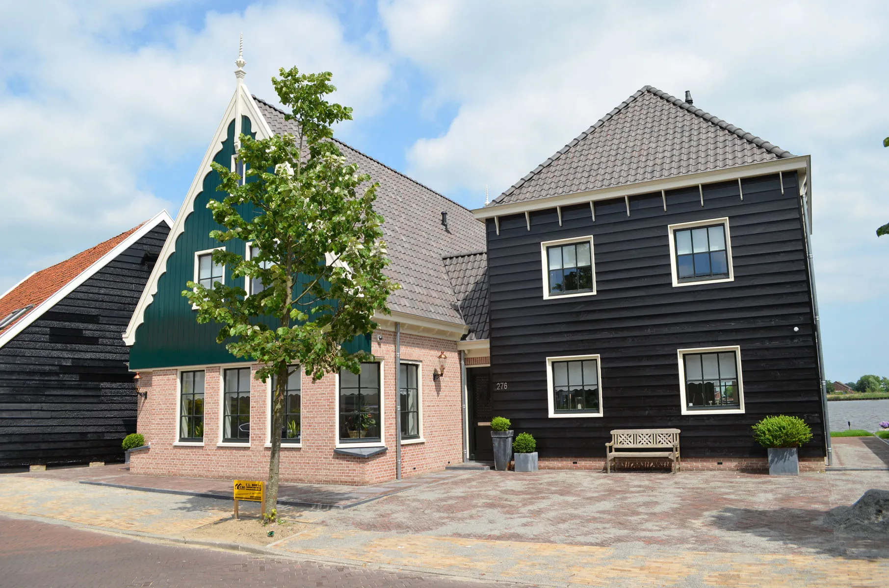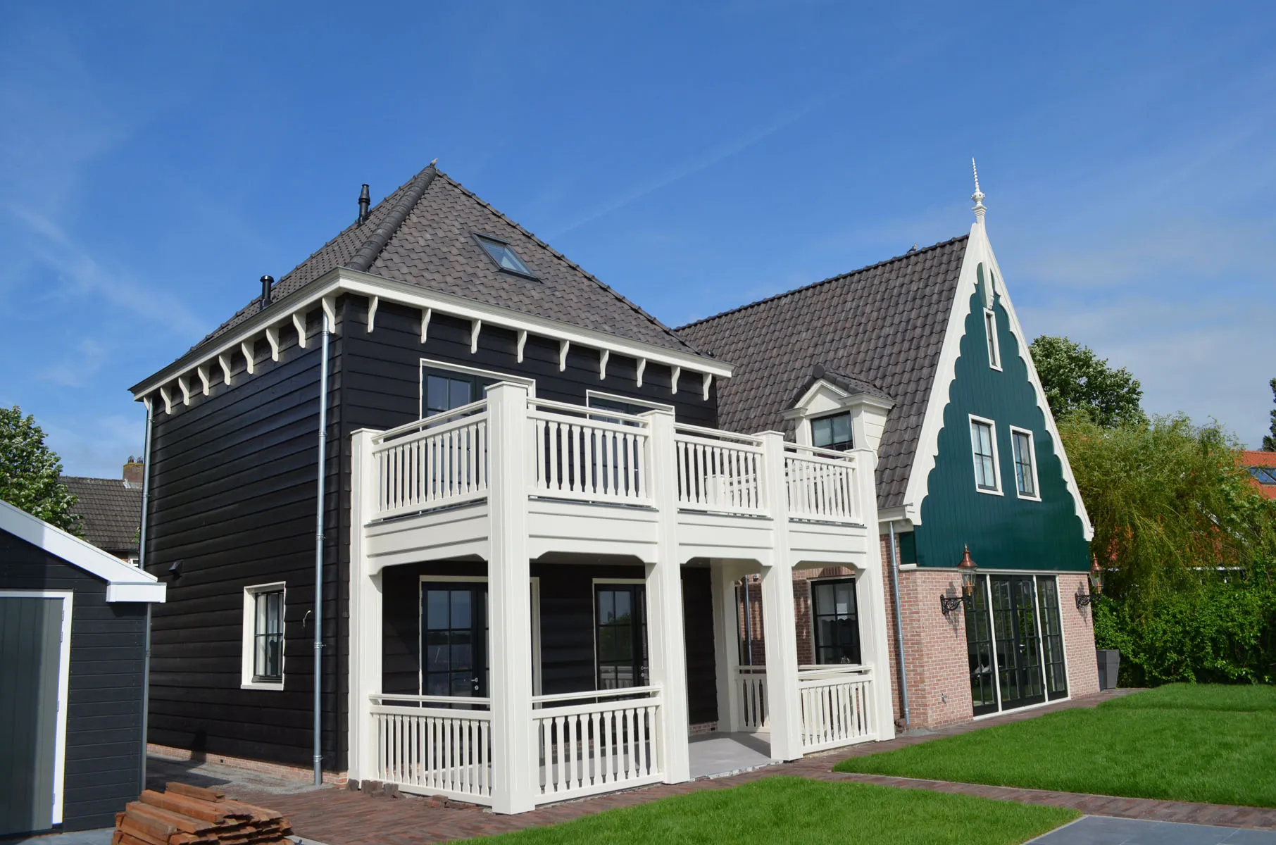 Deze bungalow valt op door de groene houten topgevel, de traditionele baksteen en de sierlijke nokdetails. De combinatie van kleuren en materialen geeft de woning een herkenbare landelijke uitstraling die verwijst naar historische streekarchitectuur. De lage gootlijn en ruime kap zorgen voor een vriendelijke en vertrouwde vorm.