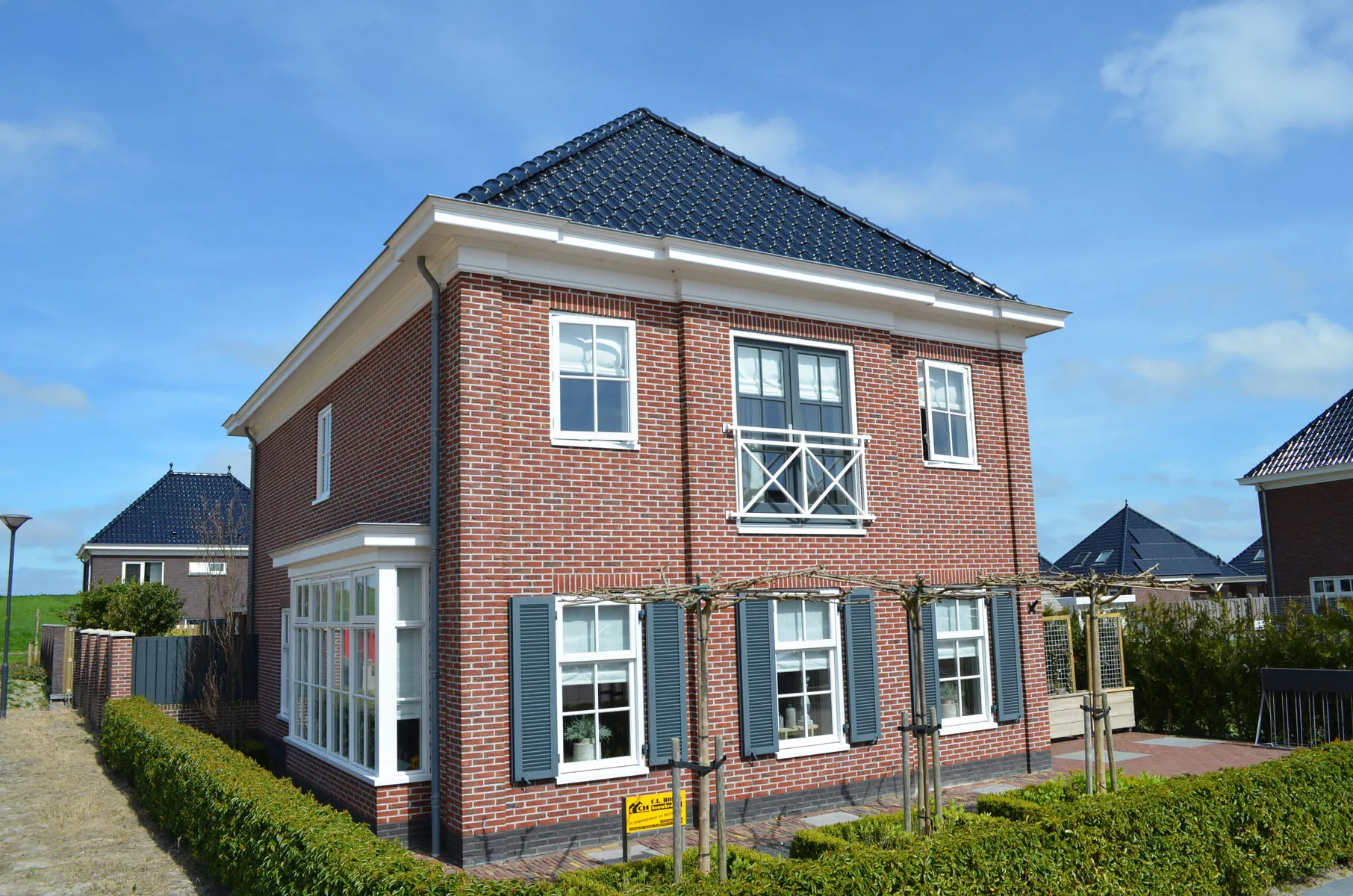 Deze prachtige villa combineert de uitstraling van een klassiek herenhuis met de warmte van landelijke architectuur. De rode baksteengevel vormt een stijlvol contrast met de diepblauwe luiken, die de woning een charmant en uitnodigend karakter geven. Het symmetrische gevelbeeld en de elegante raampartijen zorgen voor rust en balans, terwijl het balkon met kruisbalustrade een subtiel accent aan de voorzijde toevoegt.