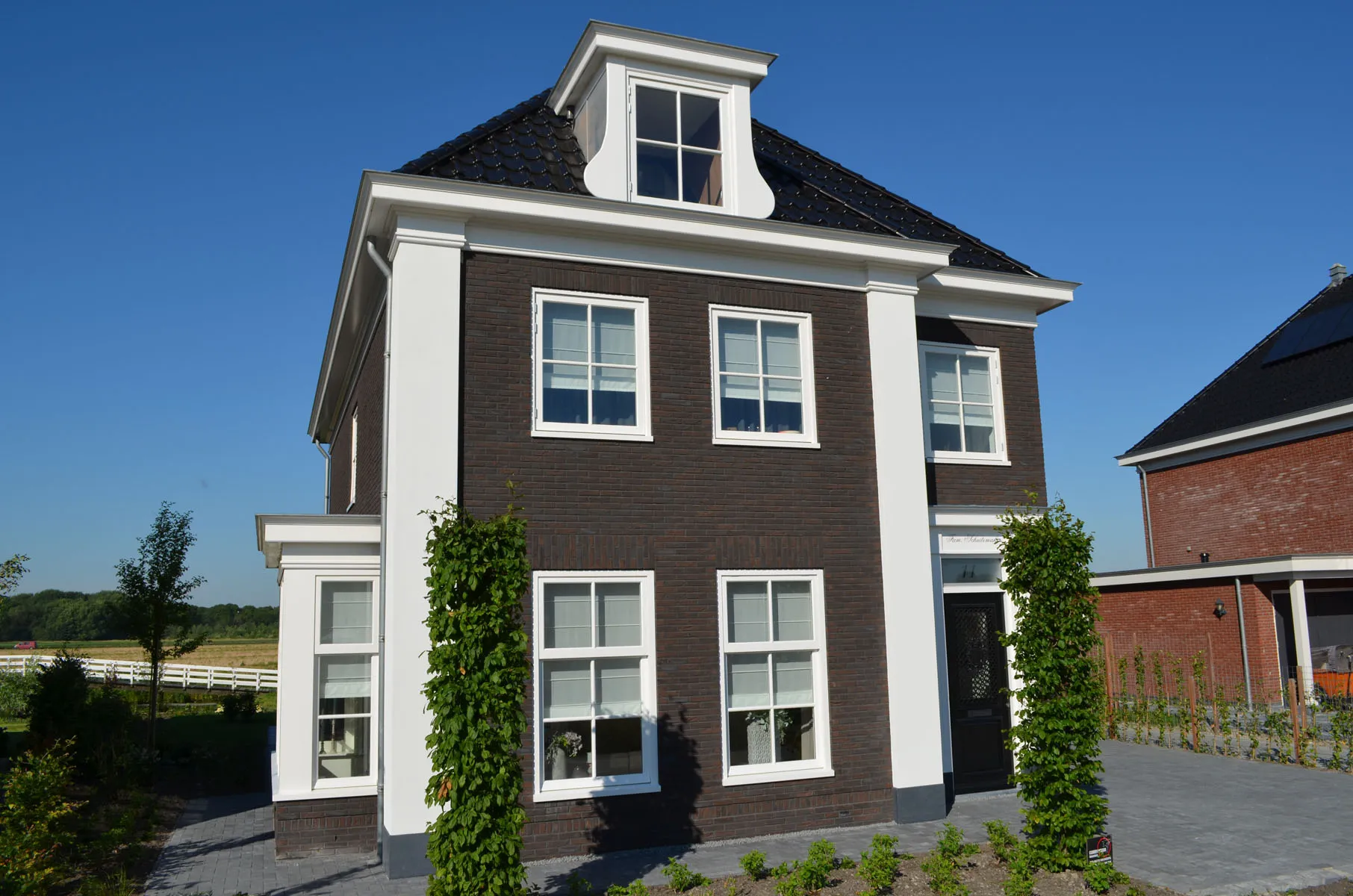Deze indrukwekkende notariswoning straalt pure klasse uit dankzij de krachtige symmetrie, het donkere metselwerk en de elegante witte geveldelen die het silhouet verfijnen. De hoge gevelpilasters geven de woning een bijna monumentale aanwezigheid, terwijl de diepe neggen en friswitte kozijnen zorgen voor een stijlvol contrast en een verzorgde, rustige uitstraling.